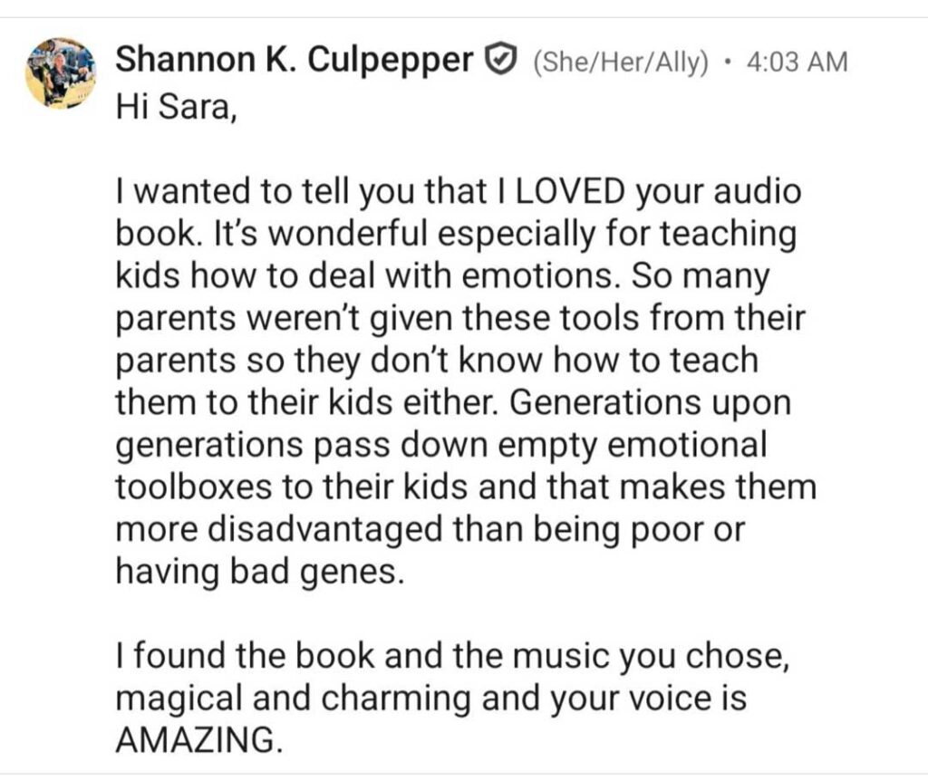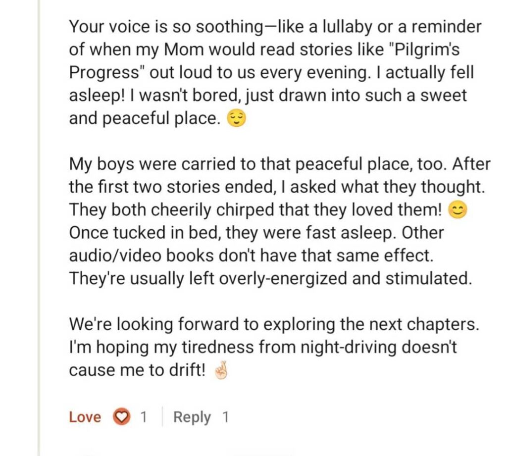 Your voice is so soothing – like a lullaby or a reminder of when my Mom would read stories like “Pilgrim’s Progress” out loud to us every evening. I actually fell asleep! I wasn’t bored, just drawn into such a sweet and peaceful place. 😌
